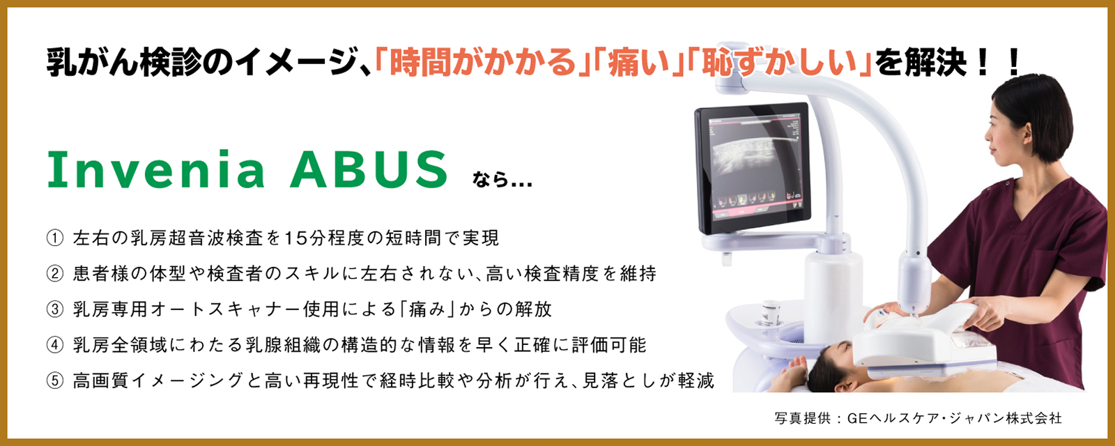 乳がん検査に対する不安や恐怖を和らげるために。そして何より、できるだけ早く、小さいうちに、乳がんを発見するために乳房用自動超音波画像診断装置「Invenia ABUS」を導入しました。