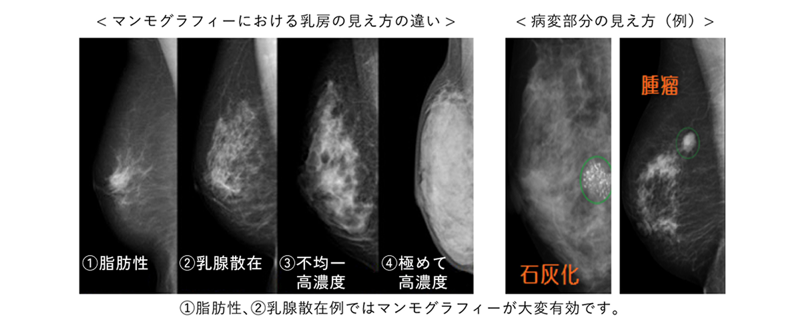 加齢とともに乳房の見え方は変わります。閉経後で乳腺が萎縮し、乳房の多くが脂肪に置き換わると乳房内の腫瘤や石灰化が見つけやすくなるため、マンモグラフィが適しています。また、マンモグラフィは過去の画像とその都度比較ができるため検診に用いられます。