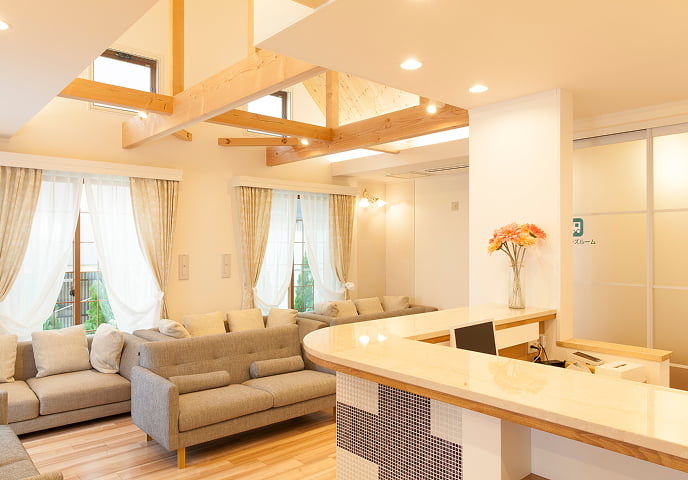 ゆったりと掛けられるソファが並ぶ待合室。天井は吹き抜けで、明るい内装です。